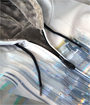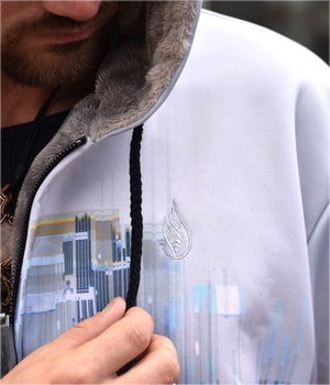 This incredibly soft Sherpa lined hoodie is our warmest item yet! This comfortable and smooth garment is an amazing mix of high end fabrics - featuring a heavyweight satin polyester on the outside and a blanket-soft sherpa lining . The intricate artwork from Beeple lines up perfectly throughout the piece.