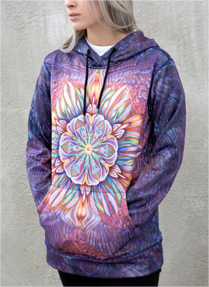 The first release of the our new women's midweight pullover hoodie, using special double sided fleece and satin polyester. This midweight and highly detailed garment features original artwork by Elizabeth Banker. Our silky smooth satin pullover features print mirrored on front and back.