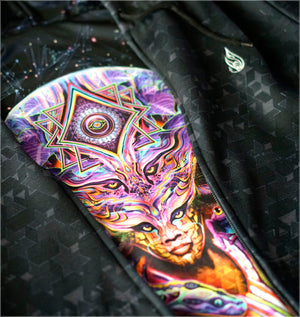 Our heavyweight satin reversible hoodie featuring original artwork by Justin Totemical. This comfortable and smooth garment is fully reversible and super warm - featuring two different types of satin polyester and two intricate designs that line up perfectly throughout the piece.