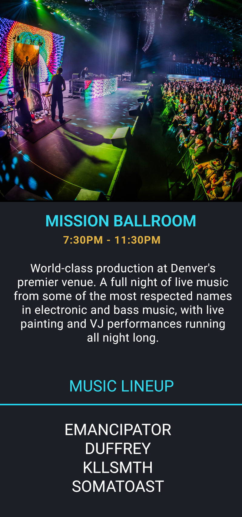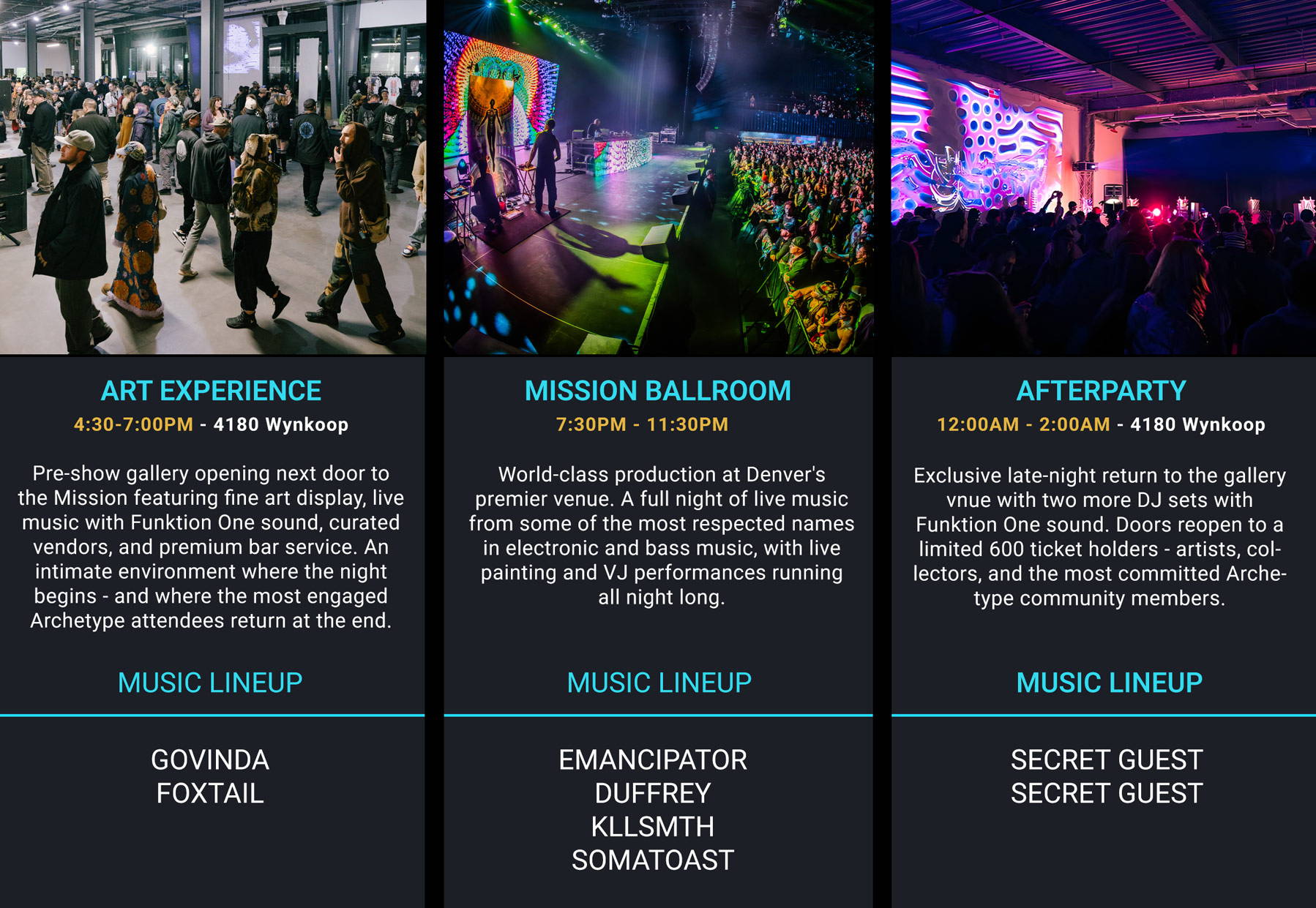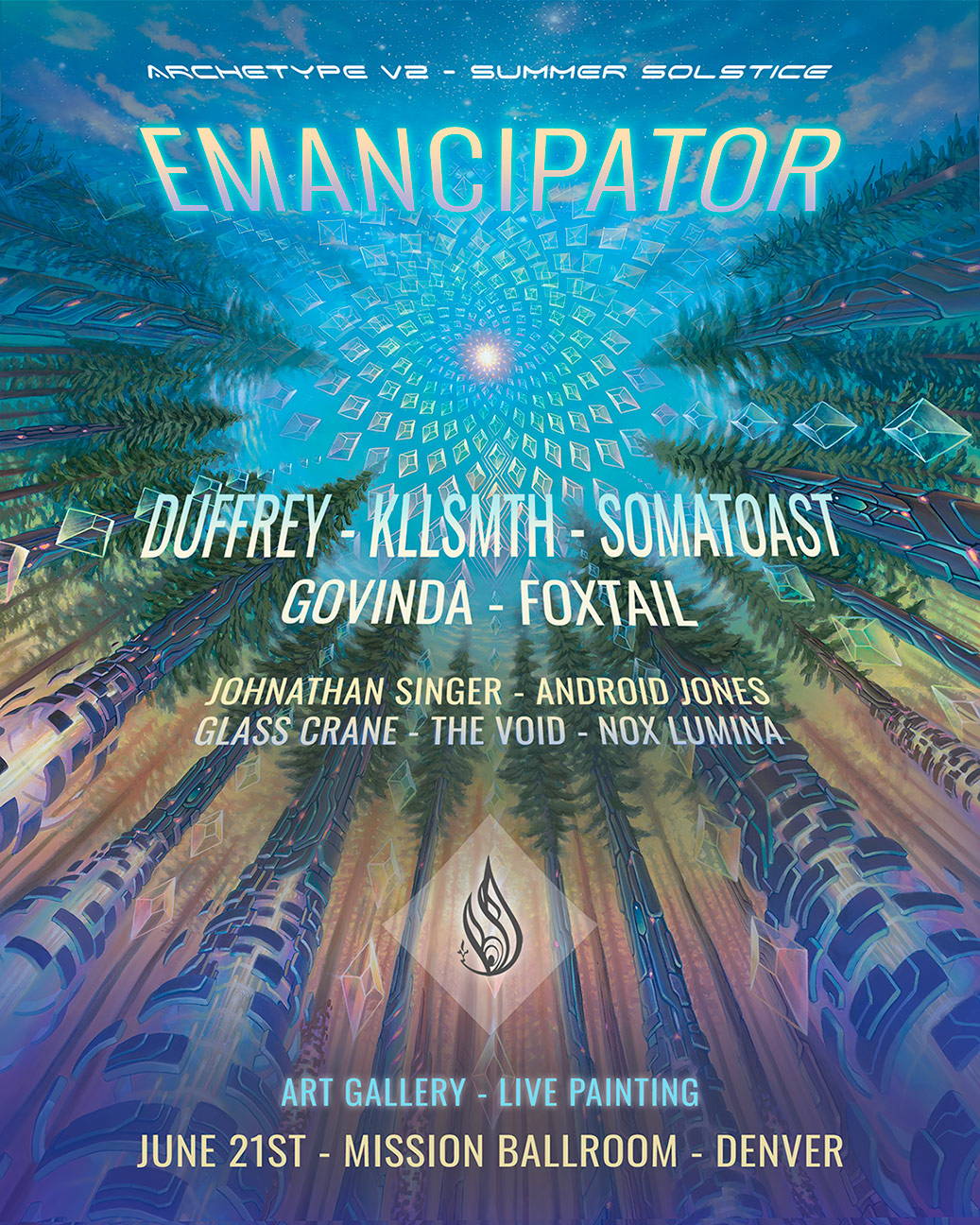 A Summer Solstice celebration in Denver you won't forget. The night begins at the gallery - an intimate pre-show art opening at 4180 Wynkoop featuring world-class visionary art, live music, and a curated market. Then the full production at Mission Ballroom.