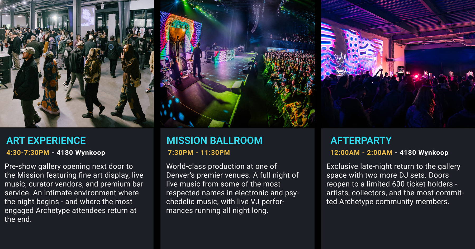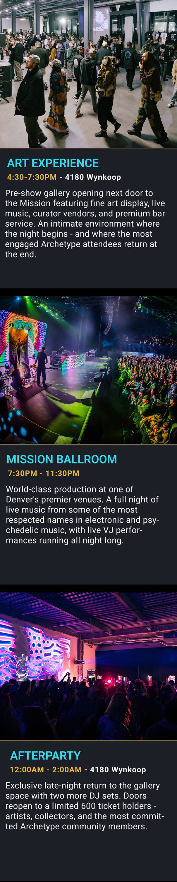 Archetype is a destination event in Denver, CO built around a simple idea: music, visual art, and physical space should work together as a single experience - not as separate elements sharing a room.
